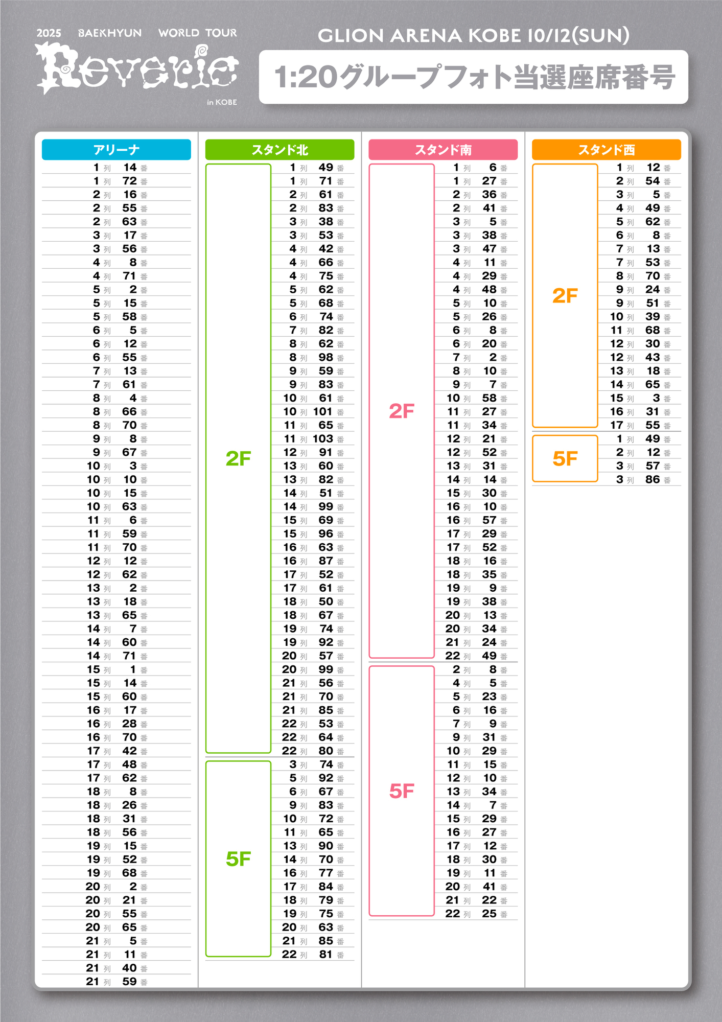 10月12日(日)開催『2025 BAEKHYUN WORLD TOUR 〈Reverie〉』の1:20グループフォトイベントの当選座席番号を以下の通りご案内いたします。